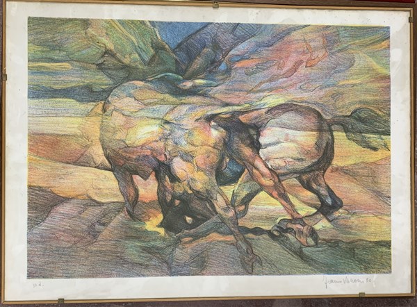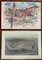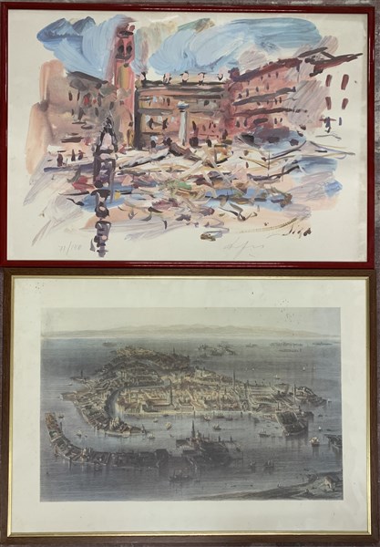 Lotto composto da due litografie, due pannelli orientali in seta ed una riproduzione (difetti) (in cornici)