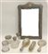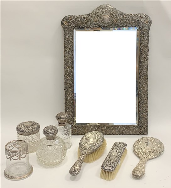 Lotto composto da un servizio da toilette in lamina d'argento sbalzato e inciso a fiori e corona ducale composto da specchio a mano, due spazzole e tre contenitori differenti. Unito a un portapennelli ed uno specchio da tavolo di manifattura differente (difetti)