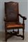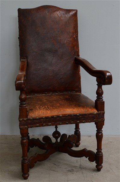 Poltrona in noce con sostegni torniti a rocchetto, braccioli mossi terminanti a ricciolo, crocera sagomata. Rivestita in cuoio (difetti)