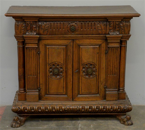 Antico credenzino intagliato in stile rinascimentale ad un cassetto e due sportelli(cm 100x90x36) (difetti)