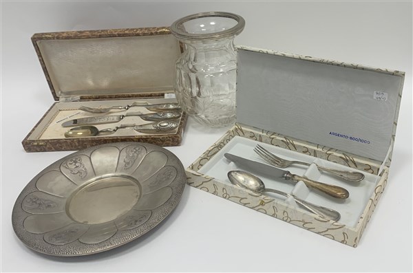Lotto composto da un vaso in vetro con ghiera e piatto in argento e due set di posate composti da cucchiaio, forchetta e coltello in argento e lamina in custodia (difetti)
