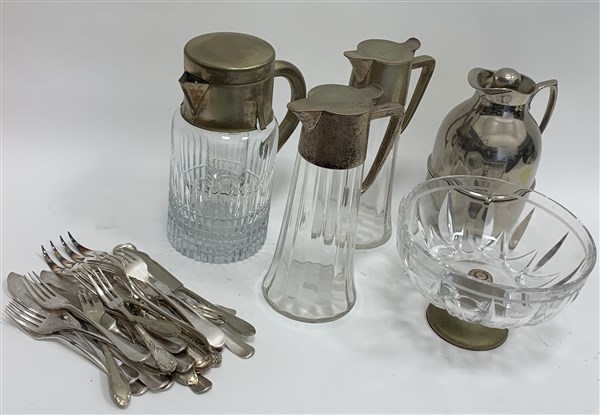 Lotto composto da quattro brocche, un centrotavola, due vassoi e numerose posate in metallo, metallo argentato e vetro (difetti)