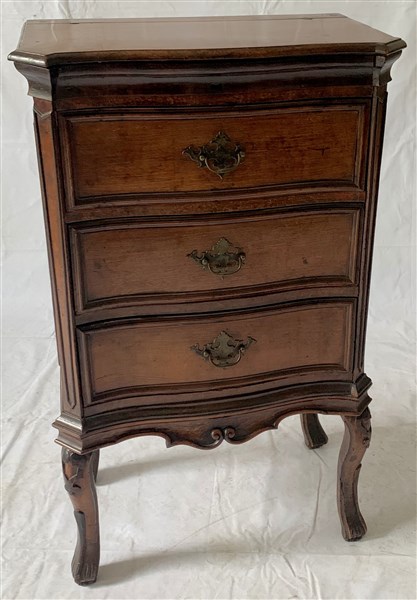 Antico comoncino in noce con fronte mosso a tre cassetti riquadrati. Pianetto a