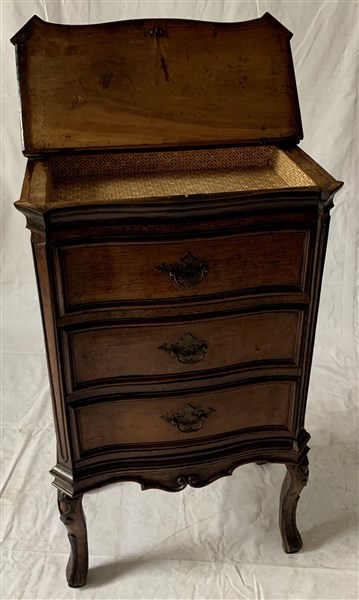 Antico comoncino in noce con fronte mosso a tre cassetti riquadrati. Pianetto apribile, fascia e gambe sagomati e intagliati (cm 58x96x33) (difetti e restauri)