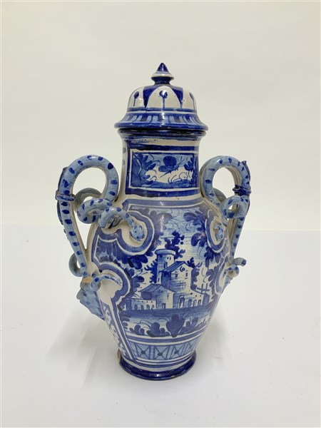 Vaso biansato con coperchio in maiolica decorata in blu a paesaggio, iscritto S.C. 1731, anse a forma di serpenti avviluppati (h cm 33) (difetti, restauri e mancanze)