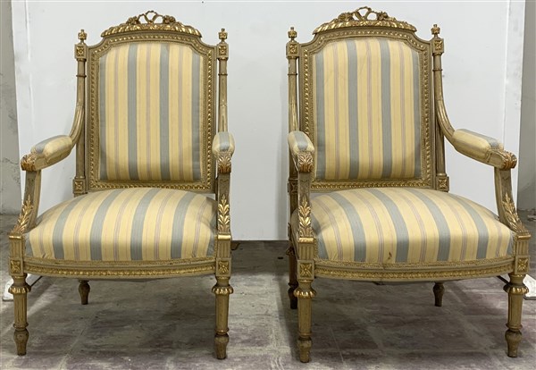 Coppia di poltrone in legno laccato e dorato, intagliato a motivi floreali e vegetali, a nastro e fiori, gambe scanalate, rivestite in tessuto a righe (difetti)