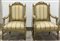 Coppia di poltrone in legno laccato e dorato, intagliato a motivi floreali e ve