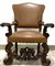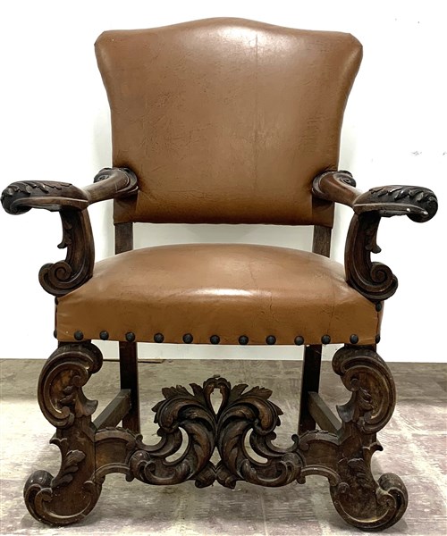 Poltrona con braccioli e fascia scolpiti a volute vegetali, rivestita in pelle
