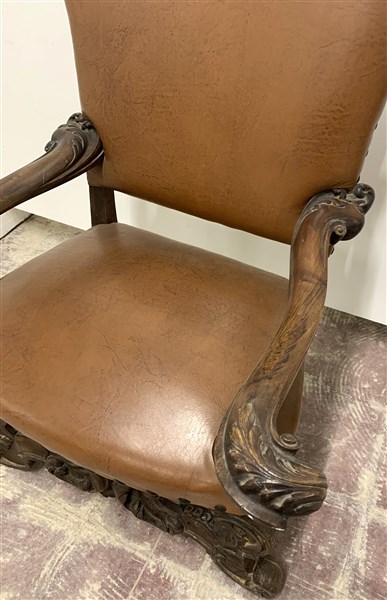 Poltrona con braccioli e fascia scolpiti a volute vegetali, rivestita in pelle (difetti)