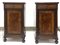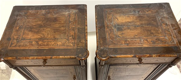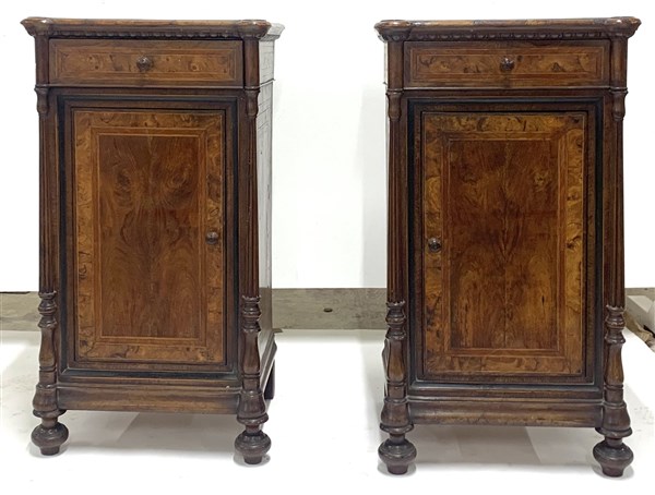 Coppia di comodini lastronati in noce e filettati. Fronte ad un cassetto ed uno sportello, montanti a mezza colonna scanalata, piedi anteriori torniti (difetti, restauri e mancanze)