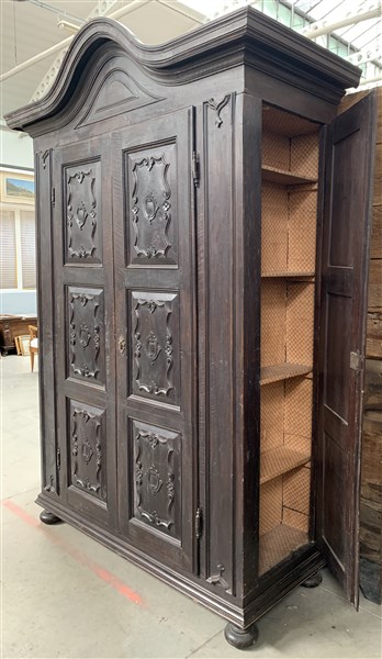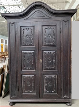 Armadio a due ante sul fronte e due laterali riquadrate e decorate da pannelli con sagome, cappello sagomato, piedi a cipolla (cm 174x250x72) Iscritto all'interno di un'antina laterale inciso "Giacomo Botineli fecce quest opera .... 1773" entro cartella (difetti e restauri)