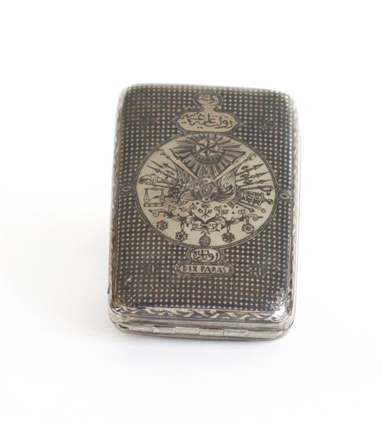 Tabacchiera in argento niellato decorata sul coperchio con "stemma dell'impero Ottomano, e iscrizione DIX PARAS (gr 75) (difetti) Turchia secolo XIX/XX