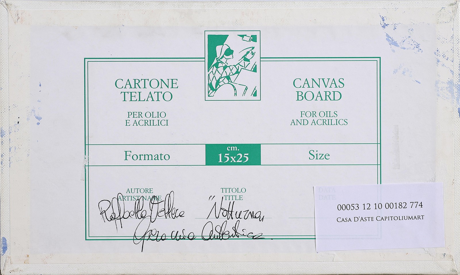 VELLERA RAFFAELLA (n. 1975) Notturno. Olio su cartone telato. Cm 15x25. Autentica dell'artista su fotografia. Firma in basso a destra. Al retro titolo, tecnica e firma per autentica.