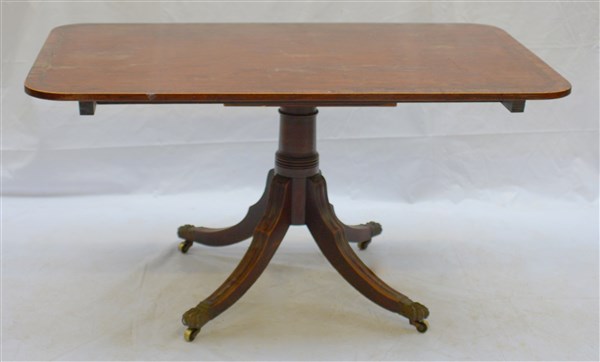 Tavolo rettangolare con piano a vela, fusto a colonna su quattro gambe desinenti a zampe ferine in metallo con rotelle. Secolo XIX (cm 142x73x86) (difetti)
