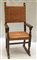 Antico seggiolone con montanti parzialmente torniti, fiamme intagliate e dorate