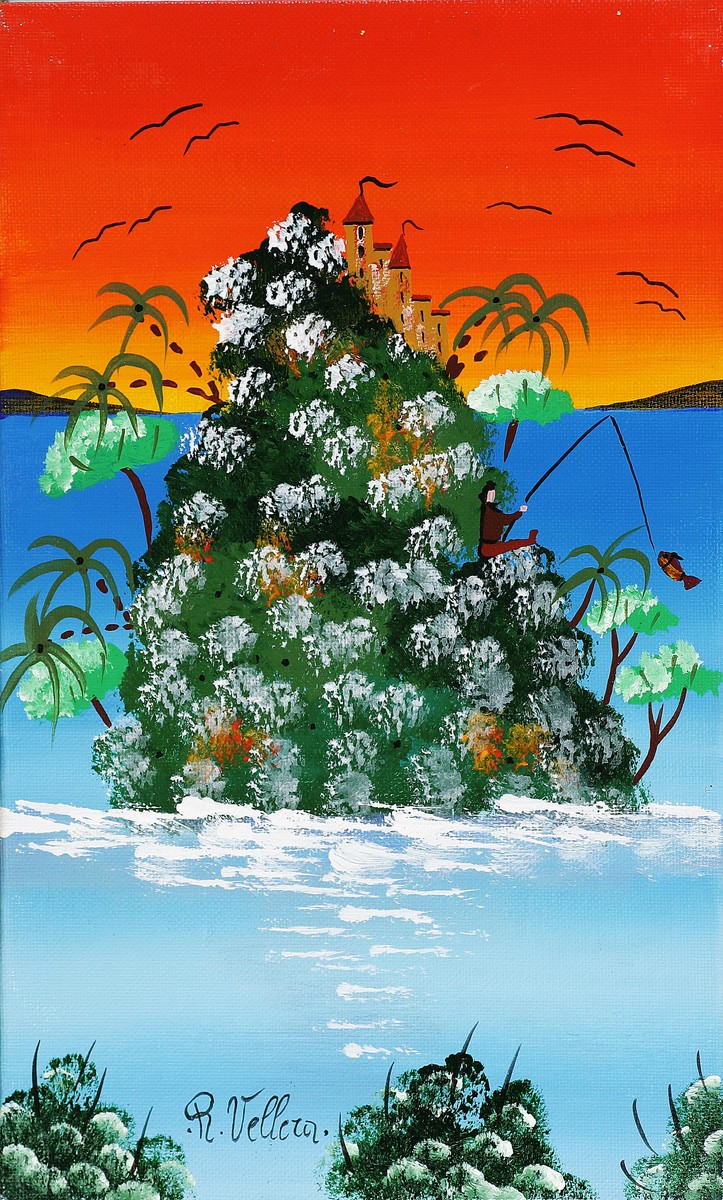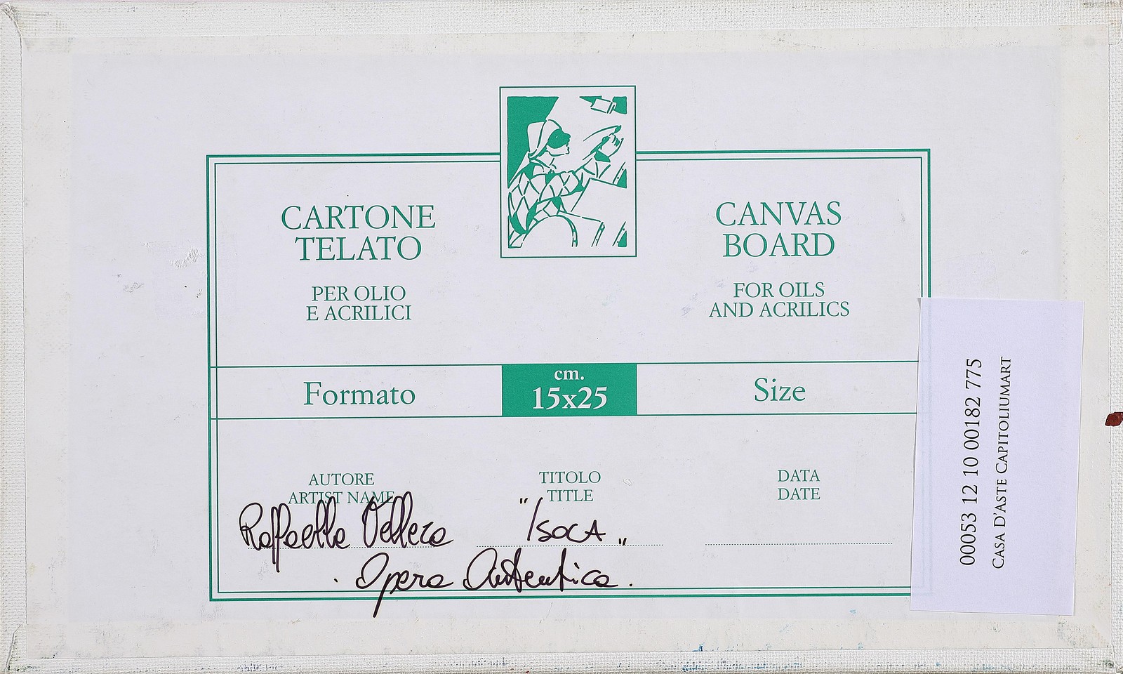 VELLERA RAFFAELLA (n. 1975) Isola. Olio su cartone telato. Cm 25x15. Autentica dell'artista su fotografia. Firma in basso al centro. Al retro titolo, tecnica e firma per autentica.