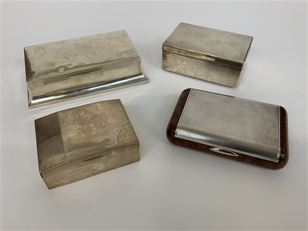 Lotto di quattro scatole portagioie in lamina d'argento, vetro e legno, una con punzoni di Birmingham (difetti)