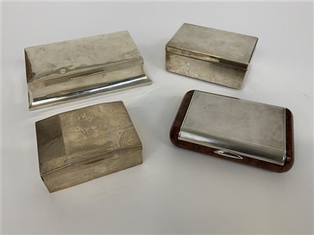 Lotto di quattro scatole portagioie in lamina d'argento, vetro e legno, una con