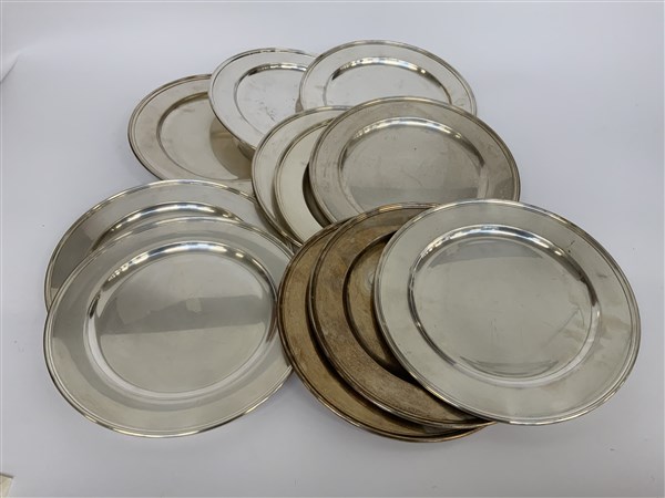 Gruppo di dodici sottopiatti in metallo argentato (d cm 30) (difetti)