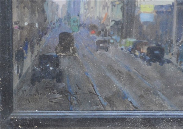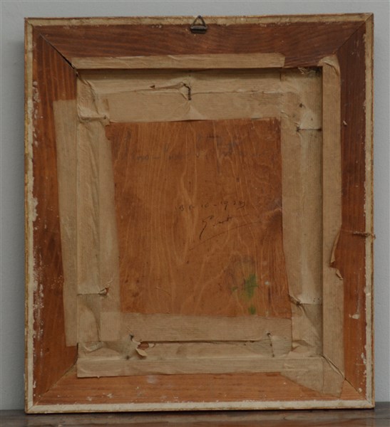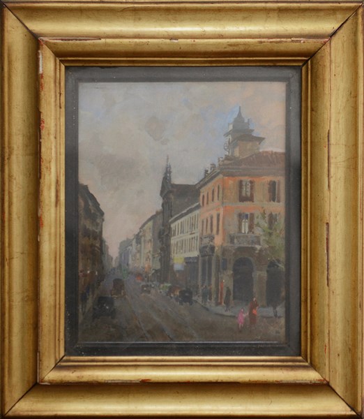 Firma indecifrata "Corso San Gottardo, Milano" olio su compensato (cm 28x23) Firmato in basso a sinistra. In cornice