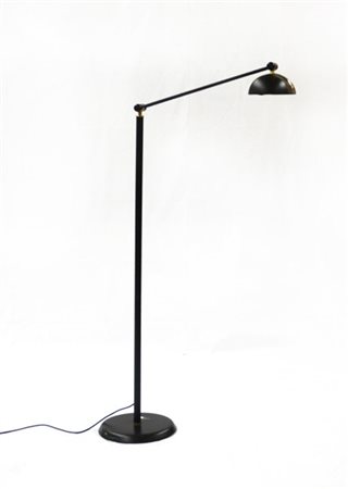 Lampada da terra alogena con struttura in metallo verniciato nero e ottone, faretto orientabile. Italia, anni '90. (h max cm 180) (lievi difetti)