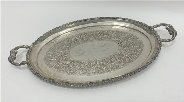 Vassoio biansato in argento con cavetto centrato da elementi naturalistici a sb