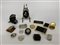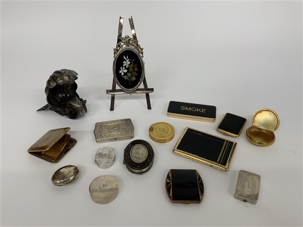 Lotto composto da una cornice porta foto con placca in pietre dure, un fregio a forma di foglia e tredici scatoline da borsa, materiali differenti (difetti)