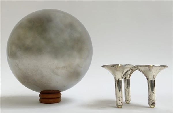 Portacandele tripode in metallo argentato unito a una sfera metallica su base i