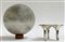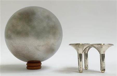 Portacandele tripode in metallo argentato unito a una sfera metallica su base in gomma. Italia, anni '90. (h cm 25) (difetti)