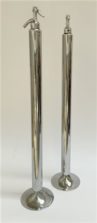 Coppia di seltzer da terra in metallo cromato. Italia, secolo XX. (h cm 85) (difetti)