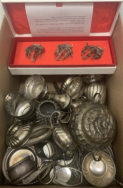 Cartone contenente numerose bomboniere ed altri oggetti in argento e metallo argentato (argento g 1540) (difetti e mancanze)