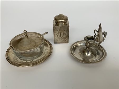 Lotto composto da una bugia con spegni moccolo e un tea caddy in argento, e una formaggiera con cucchiaino in argento e vetro, manifatture differenti (g 550) (difetti)