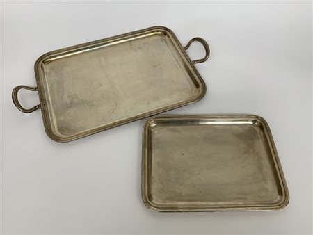 Lotto di due vassoi in argento di cui uno biansato (cm 33x25 e 58x34) (g 2300 circa) (difetti)