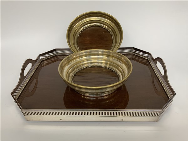 Carlo Mozzoni - Lotto composto da un vassoio biansato con bordo a ringhiera (cm 50x40) e una coppia di cesti per frutta (d cm 25,5). Metallo argentato con basi in legno, marcati alla base (difetti)