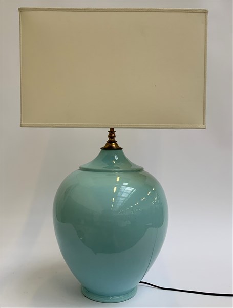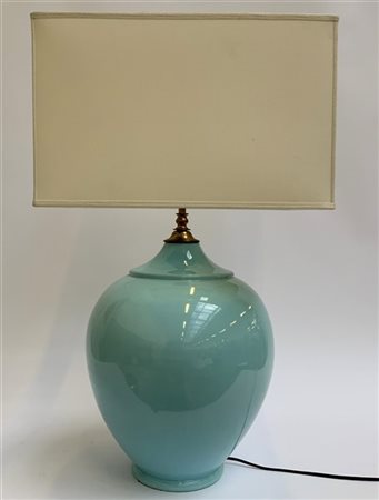 Lampada da tavolo di forma sferica in ceramica smaltata con paralume in stoffa (h cm 50)