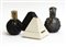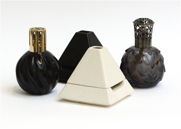 Lotto composto da due boccette in vetro soffiato a stampo grigio e tappo metallico, marcate sotto la base Lampe Berger unito a due diffusori per profumo di forma piramidale in ceramica bianca e nera, uno firmato sotto la base "Clement France". Francia, secolo XX. (h max cm 15)