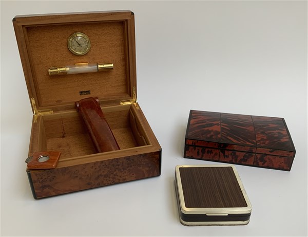 Gruppo di tre scatole, una lastronata in radica (portasigari), una in tartaruga e una in legno e argento