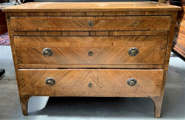 Comò a tre cassetti lastronato in noce e decorato con filettature. Lombardia, secolo XVIII (cm 112x86x55) (difetti e mancanze)