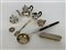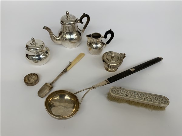 Lotto composto da una teiera, lattiera e zuccheriera a corpo liscio, una saliera inglese con coperchio, in argento. Un mestolo, una palettina, un metro e una spazzola in argento e lamina d'argento (g 690 circa) (difetti e mancanze)