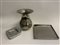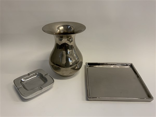 Lotto composto da un vassoio in ceramica smaltata a specchio, unito ad un posacenere fusione di alluminio e un vaso in ottone nichelato metallo di epoche e manifatture differenti. Anni '90. (lievi difetti)