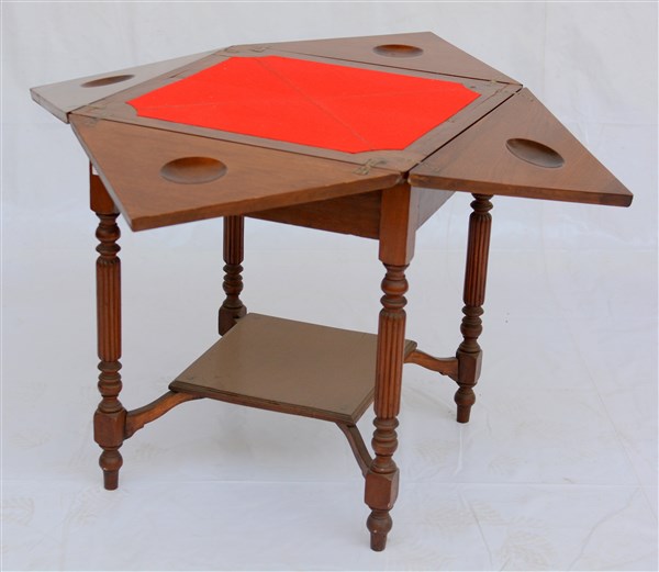 Tavolino da gioco a fazzoletto in mogano ad un cassetto nella fascia, gambe tornite e scanalate riunite da pianetto. Inghilterra inizio sec. XX (cm 58x70x58)