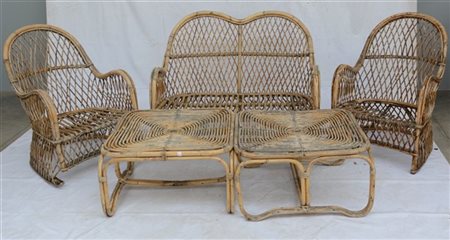Fornitura da veranda composta da un divano a due posti, due poltrone e due tavolini in manao e giunco. Esecuzione gervasoni, Italia, anni 80 (gravi difetti)