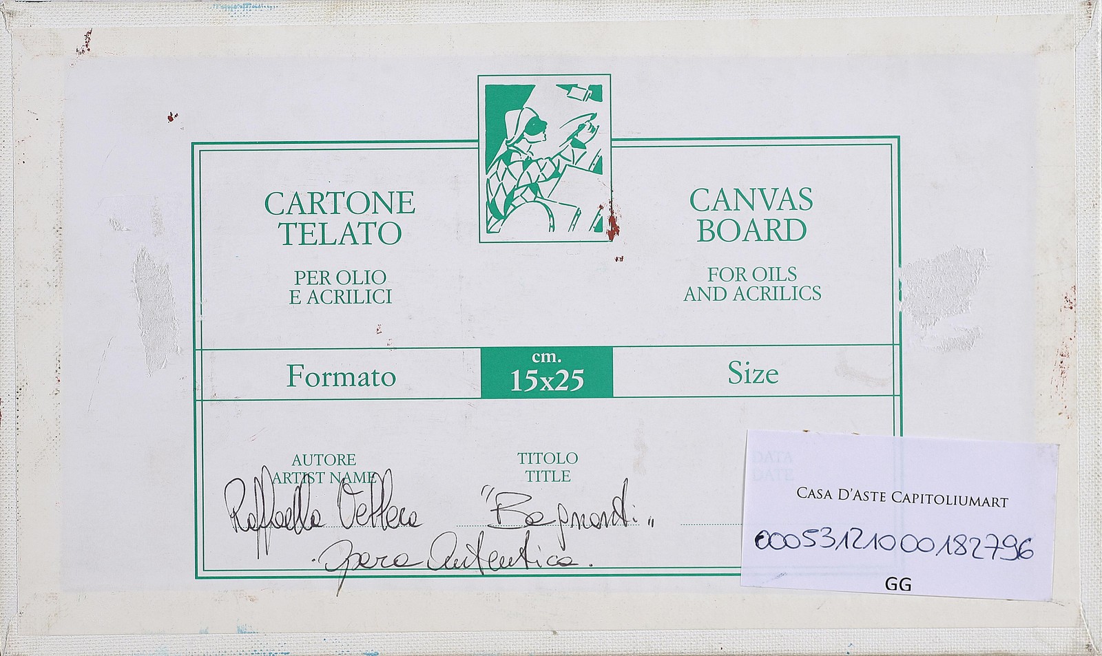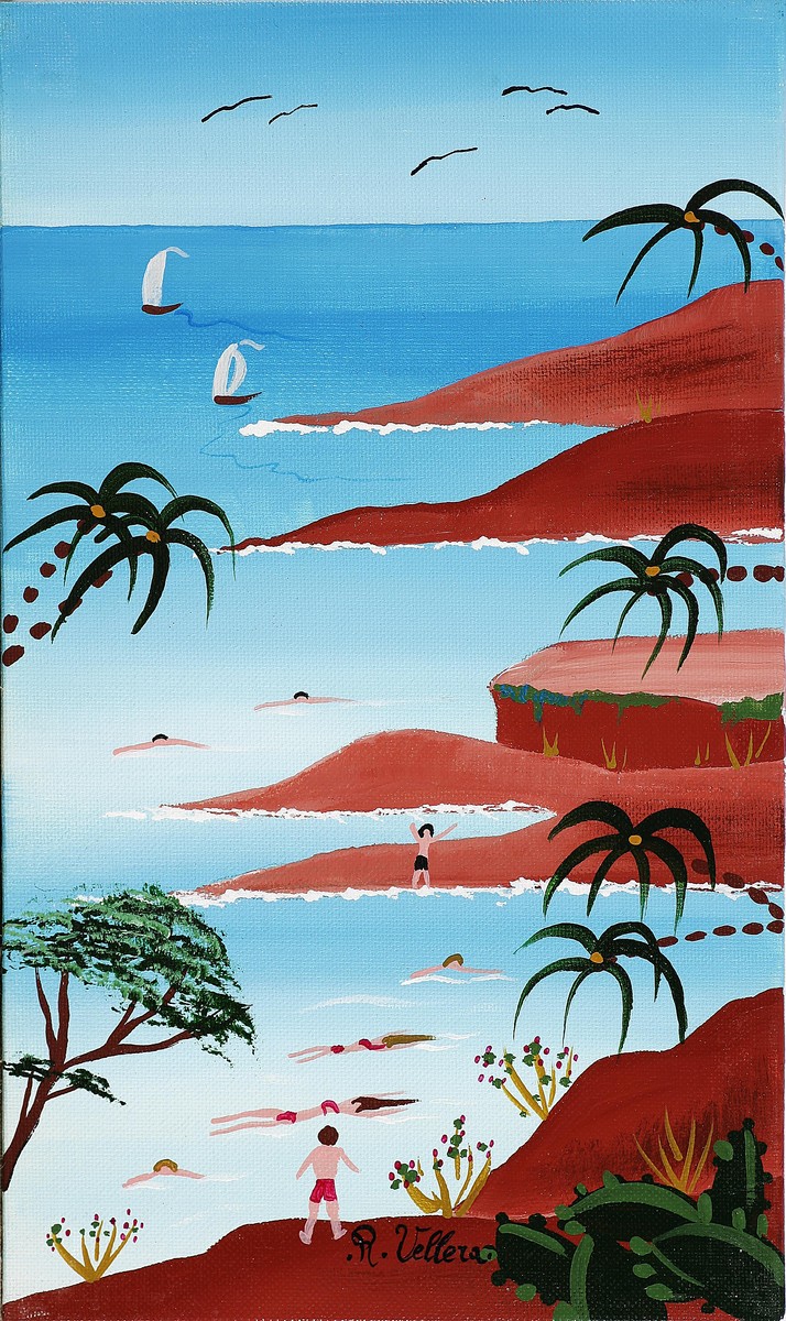 VELLERA RAFFAELLA (n. 1975) Bagnanti. Olio su cartone telato. Cm 25x15. Autentica dell'artista su fotografia. Firma in basso al centro. Al retro firma per autentica, titolo e tecnica.