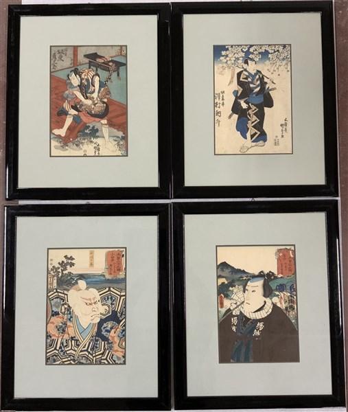 Gruppo di quattro stampe a colori raffiguranti attori del teatro Kabuki (cm 35 x 24 circa), in cornici (lievi difetti)