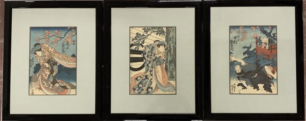 Gruppo di tre stampe a colori raffiguranti scene del teatro Kabuki (cm 35 x 24), in cornici (lievi difetti)