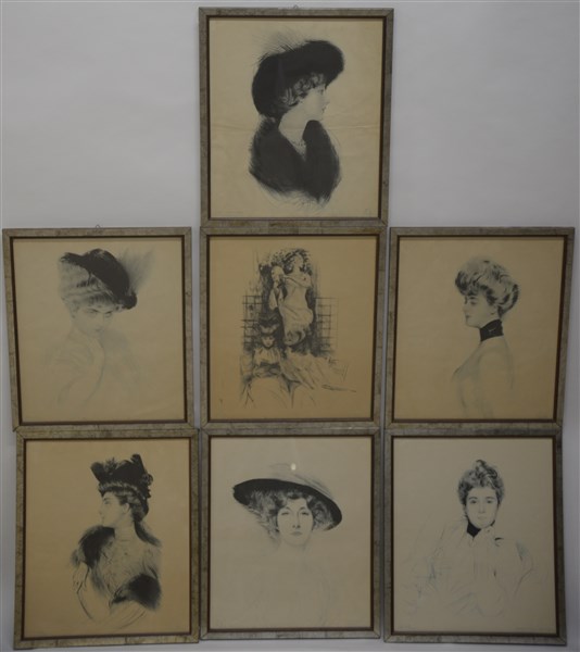 Gruppo di sette riproduzioni di ritratti femminili da Paul César Helleu (cm 40x