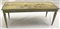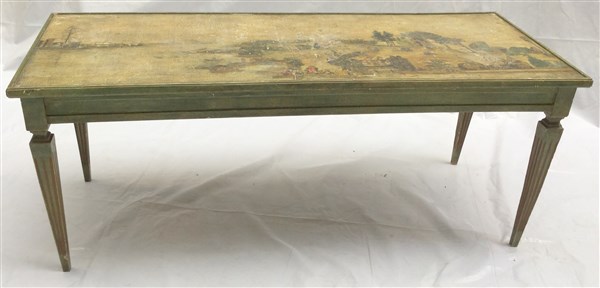 Tavolino da salotto in legno laccato, piano raffigurante un paesaggio realizzato con la tecnica dell'arte povera (cm 126x50x53) (difetti e mancanze)