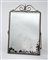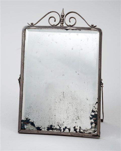 Specchio da tavolo in metallo cromato sormontato da fregio a volute stilizzate,