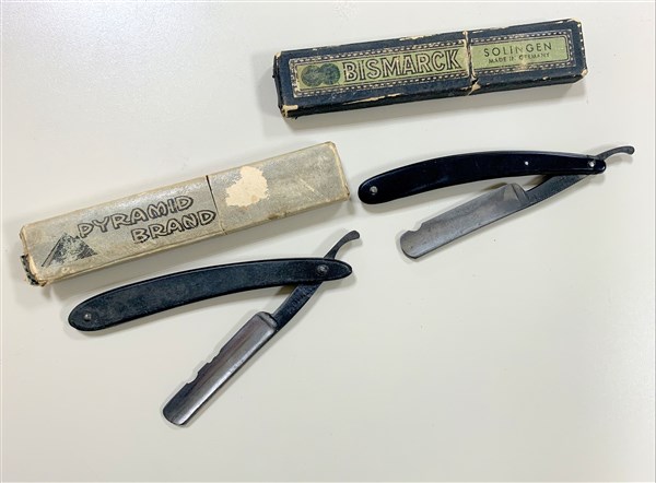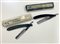 Specchio da tavolo in metallo cromato sormontato da fregio a volute stilizzate, 1930 circa, unito a due rasoi a mano della stessa epoca