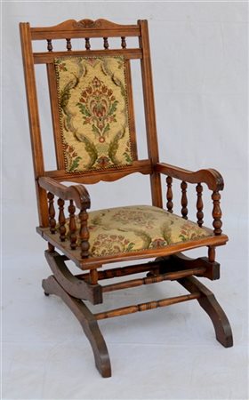 Poltrona a dondolo in legno di frutto. Schienale e braccioli decorati a colonne tornite, base sagomata (difetti)